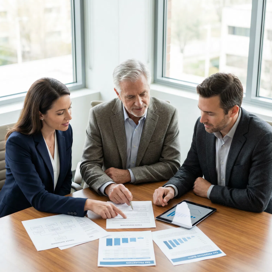 Young female doctor sitting in meeting at hospital conference room. Hospital staff in boardroom meeting listening to administrator.